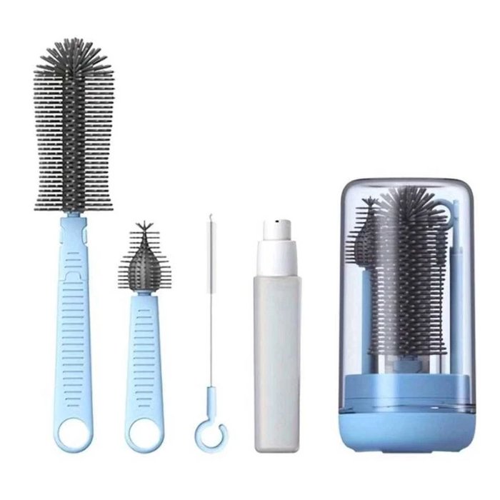 Kit Escova de Limpeza 4 em 1 Mamadeira Garrafa Copo Bebe Criança Higiene Limpeza Bolsa Mala Portatil Azul