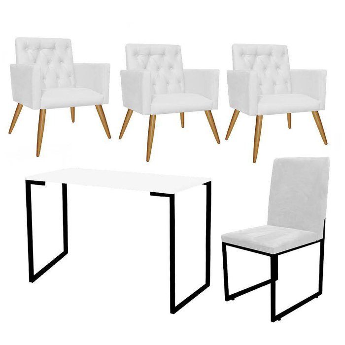 Kit Escritório Stan 3 Poltronas Capitonê Com Cadeira E Mesa Industrial Branco Preto Corino Branco - Ahazzo Móveis