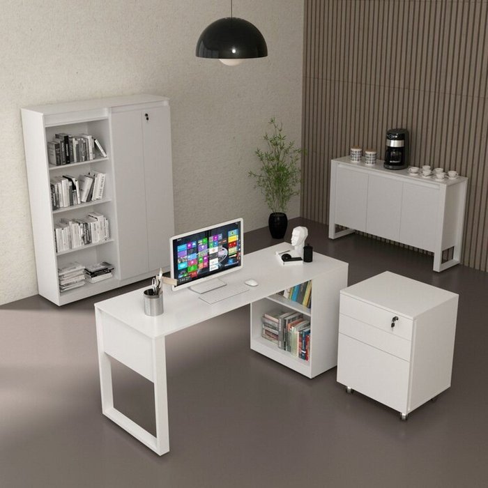Kit Escritório 5 Peças com 1 Escrivaninhas, 1 Gaveteiro, 1 Estante e 2 Armários Multiuso Branco