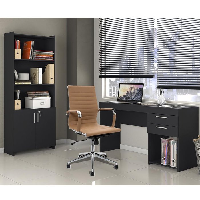 Conjunto Kit Escritório Completo / Home Office 3 Peças composto por Mesa Office com 2 Gavetas com Armário Multiuso Escritório Preto e Cadeira Giratória Boston Caramelo
