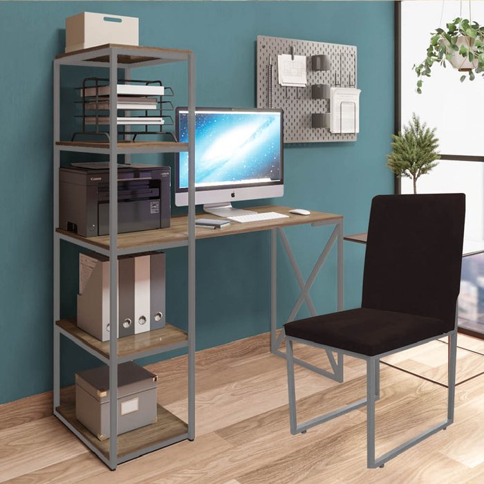 Kit Escritório Mesa Max BeX 5 Prateleiras e Cadeira Stan Cinza Tampo Castanho Suede Marrom -