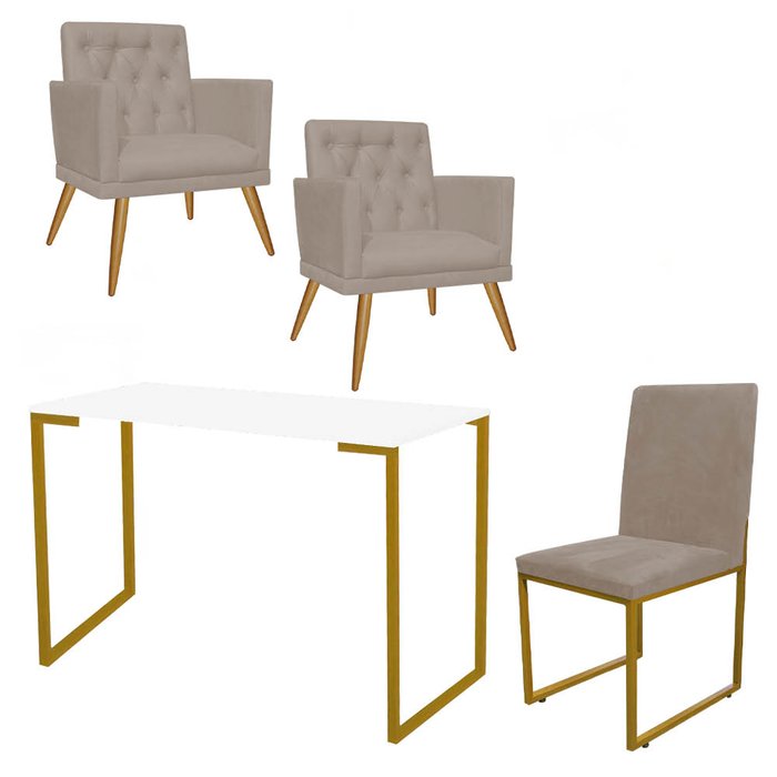 Kit Escritório Stan 2 Poltronas Maria e Cadeira e Mesa Industrial Branco Dourado Suede Bege -