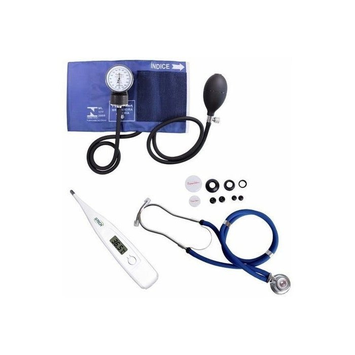 Kit Esfigmomanômetro + Estetoscópio Duplo + Termômetro - Azul