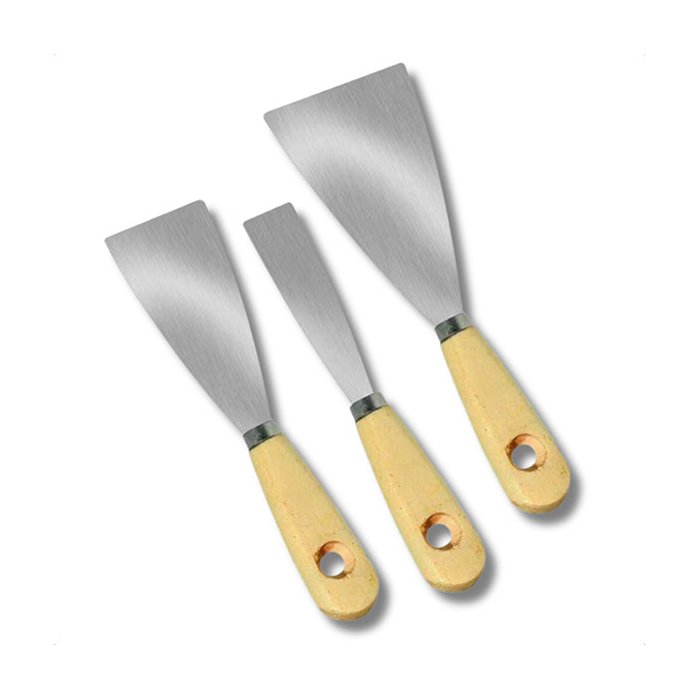 Nosso Kit com estipuladas são formadas por 3 diferentes modelos e tamanhos de espátulas para você fazer reparos como: Descascar paredes, passar massa corrida e outros.