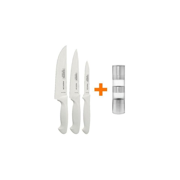 Jogo de Facas Premium com Lâminas em Aço Inox e Cabos de Polipropileno Branco 3 Peças - Tramontina 24499811 Garantia: 90 dias para vícios ou defeitos de fabricação. As lâminas de aço inox tem maior durabilidade do fio devido ao tratamento térmico.