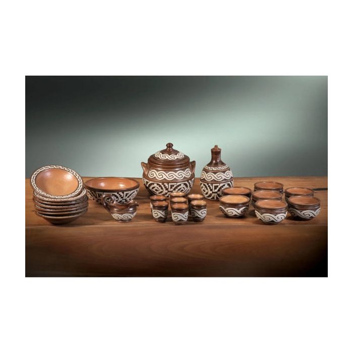 Jogo para servir Feijoada. Fabricado na mais pura cerâmica e pintada com símbolos Marajoara. Ideal para servir feijoadas em sua mesa com requinte e estilo.Típicos da região de Belém do Pará, onde a cultura indígena é bem presente e vem sendo cultivada através da cerâmica marajoara.
