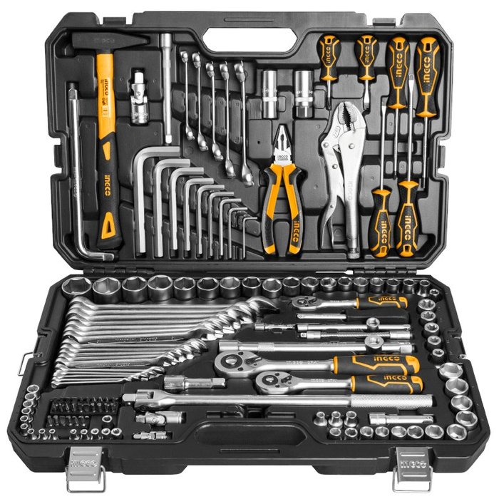 Kit de ferramentas com 142 peças INGCOA INGCO produz ferramentas de alta qualidade para uso profissional e industrial, está presente em mais de 180 países e agora também no Brasil!Fazem parte do kit:Encaixes 1/2"19 Soquetes Hexagonais encaixe 1/2": 8-10-12-13-14-15-16-17-18-19-20-21-22-23-24-25-27-30-32mm5 Soquetes Estriados encaixe 1/2": E10-E12-E14-E16-E201 Junta universal 1/2/’ x 15"1 Chave Catraca 1/2" 45 dentes2 Barras extensoras 1/2":75mm (3") & 250mm (10")1 Junta Universal 1/2"1 Adaptador 3 vias 3/8"(F) x 1/2"(M)2 Soquetes de Vela 1/2":16mm & 21mm1 Alavanca L encaixe 1/2" x 10"Encaixes 3/8"15 Soquetes 12 pontas 3/8": 6-7-8-9-10-11-12-13-14-15-17-18-19-21-221 Chave Catraca 3/8" 45 dentes2 Barras extensoras 3/8”:75mm (3") e 150mm (6")1 Junta Universal 3/8"Encaixes 1/4"26 Chaves Bits 1/4" x 25mm: PH0-PH1-PH2-P3-PZ0-PZ1-PZ2-PZ3-SL4-SL5.5-SL7-H2-H3-H4-H5-H6-H7-H8-H10-T10H-T15H-T20H-T25H-T27H-T30H-T40H1 Adaptador para Bits9 Soquetes hexagonais 1/4": 4-4.5-5-5.5-6-7-8-9-105 Soquetes Estriados 1/4": E4-E5-E6-E7-E81 Chave Catraca 1/4" 45 Dentes3 Barras Extensoras 1/4": 50mm (2") 100mm (4") 150mm (6")1 Junta Universal 1/4"1 Adaptador 3 vias 3/8"(F) x 1/4"(M)1 Alavanca Articulada 1/4" x 6” (150mm)1 Barra Extensora Flexível 1/4" x 6” (150mm)Outras Ferramentas:17 Chaves Combinadas: 6-7-8-9-10-11-12-13-14-15-16-17-18-19-21-22-245 Chaves Estrela Abertas: 8*10-10*12-11*13-12*14-17*1910 Chaves Allen: 2.5-3-4-5-6-7-8-10-12-14mm1 Martelo Pena 300g com Cabo em Fibra1 Alicate Universal 7''1 Alicate de Pressão Mordente Curvo 10”3 Chaves de Fenda: 1/4” x 1.1/2”; 1/4" x 4"; 1/4" x 6"3 Chaves Phillips PH2: 1/4” x 1.1/2”; 1/4" x 4"; 1/4" x 6"Acondicionados em maleta plásticaAcompanha também uma maleta plástica para o armazenamento das ferramentasPeso: 14kgCódigo do fabricante: HKTH21421