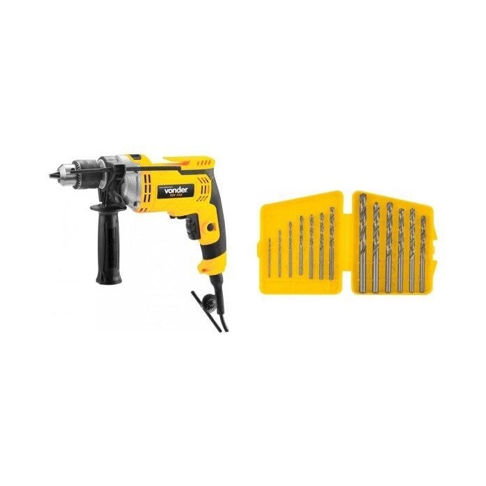 Kit Ferramentas Espresso Móveis com Furadeira de Impacto 220V e Jogo de Brocas de Aço Rápido 15mm a Amarelo