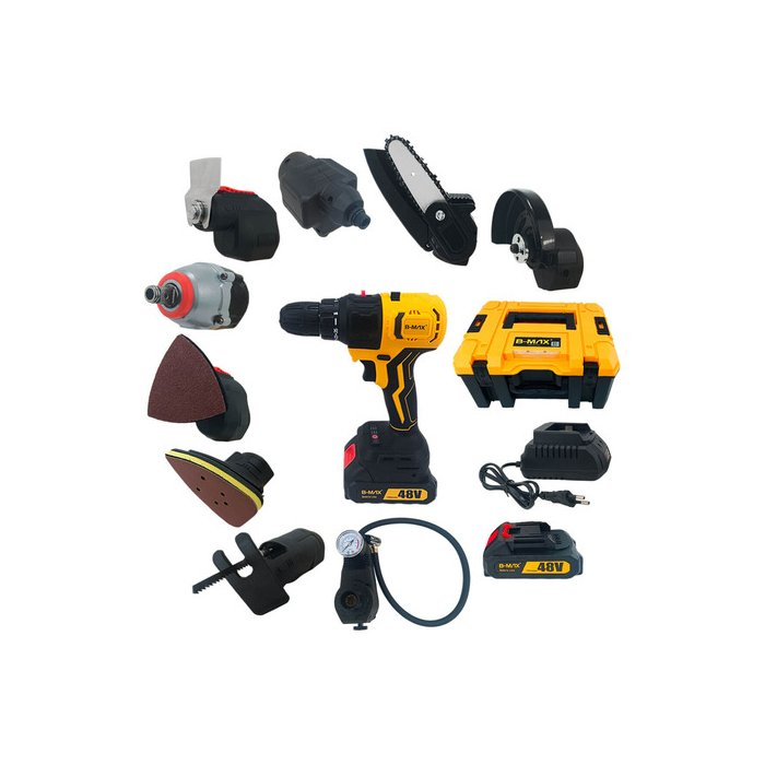 O Kit Ferramentas Furadeira Multifuncional 9 em 1 oferece versatilidade e eficiência para diversas tarefas, equipado com um motor sem escova e sistema Quick Connect para trocas rápidas das cabeças de função. Com duas baterias de 48V 1000mAh, permite uso contínuo e duradouro, alcançando até 24000rpm com ajuste de velocidade. Este kit inclui 9 cabeças de função: parafusadeira, compressor de ar, lixadeira, mini motosserra, lavadora, esmerilhadeira, lixadeira de madeira com encaixe de lâminas, serra tico-tico, e chave de impacto. Ideal para trabalhos variados, com as cabeças intercambiáveis proporciona uma solução completa e prática para suas necessidades de reparo e manutenção.