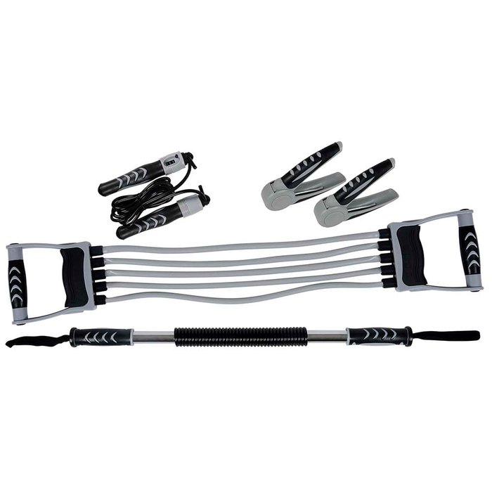 | Informações importantes | 02 Exercitadores de mão - 3cm x 10cm x 14,5cm Força aplicada: 20kg 01 Corda de pular - Ø4cm x 3,10m 01 Contador de pulos na mão direita 01 Extensor multifuncional - 72,5cm x 11cm x 3cm Força aplicada - 01 elastico: 2,3kg / 05 elasticos: 11,5kg Com 5 níveis de força ajustaveis 01 Barra flexível power twister - Ø3,7cm x 65,5cm Peso: 1,277kg Força aplicada: 30kg |