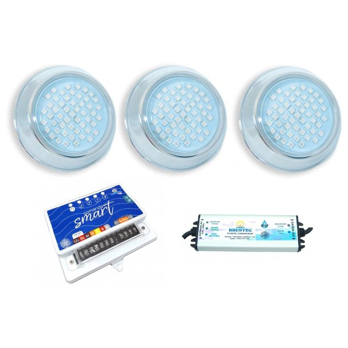 FONTE 12V 3A=============================Fonte chaveada blindada para ligar refletores monocromáticos (branco ou azul).Retifica/regula a tensão de alimentação dos refletores para 12V, além de ser blindada contra a entrada de água.Disponível para correntes de 3A, 6A(verificar modelo e quantidade de refletores a serem instalados).Para correntes maiores que 12A, utilizar o “comando monocromático (fonte) com interruptor”, que também se encontra no site. PAINEL LED RGB SMB 72W===========================================O comando smart wi-fi oferece a você e sua piscina, total controle da iluminação.Pelo celular, notebook ou tablet, seja através da rede wi-fi ou conexão direta, o comando smart wi-fi oferece seleção de cores de iluminação e diversas outras funcionalidades.Possui também timer programável independente para saídas auxiliares e refletores.REFLETOR LED RGB 5W:=======================================O Refletor LED RGB 5W da Brustec foi especialmente desenvolvido para quem busca alto rendimento e baixo consumo de energia para a iluminação de sua piscina. Os produtos Brustec são fabricados por uma indústria totalmente Brasileira.