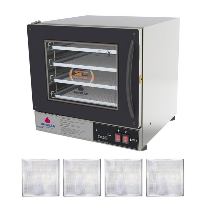 COMPONENTES DO KIT:- 1 Forno Turbo Elétrico Plus Digital Fast Oven Prp-004 G2 220V - Progás - 4 Formas de Alumínio Perfurado 35cm x 35xm x 1cm (extra)Forno Turbo Fest Oven PRP004 Plus Elétrico Digital – Progás 220VDescrição Técnica:Este equipamento é utilizado para assar pizzas, lasanhas, pães de queijo, bolos, salgados e carnes, proporcionando um cozimento uniforme.- Este forno é fabricado em aço inoxidável escovado. - Porta em vidro temperado 4 mm - Isolamento térmico com lã basáltica. - Painel com teclas (turbina) e lâmpada. - Controlador de temperatura 0°C a 250°C. - Controlador com timer de 360 minutos- Timer - Motor monofásico - 1/30 CV. - Iluminação interna . - Resistência blindada de 2000 W.- Turbina que distribui o calor uniformimente. - Tensão: 220 Volts - Acompanha 4 esteiras 35cm x 35cm X 1cm ALUMÍNIO. - Espaço entre as bandeijas - 7cm - Frequência: 50/60 Hz - Potência: 2000 w - Consumo 1,5 Kw/h - Peso Líquido – 24,2Kg - Peso Bruto – 27,1kg - Medidas Internas: 33 cm A x 46cm L x 43 cm P - Medidas Externas: 50,5 cm A x 51,5cm L x 65 cm P - Medidas Embaladas: 54 cm A x 55 cm L x 67 cm PMesa Para Fornos Prp-004 Mes-004 - Progás Ideal para o apoio do forno e para alocar assadeiras, tamanho padrão 35x35- Tampo em aço inox escovado; - Capacidade 8 Níveis para assadeiras 35x35; - Estrutura em aço carbono com pintura epóxi; - Sapatas plásticas.Medidas Totais: 90,6 cm A x 60 cm L x 60 cm P Medidas da Embalagem: 14 cm A x 63 cm L x 90 cm P Peso Líquido: 16 kg Peso Bruto: 18 kg