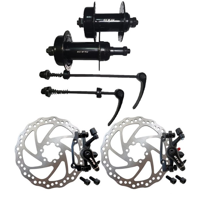 | Itens Inclusos | 1 par de freios a disco mecânico com pinças e discos, 1 par de cubo dianteiro e traseiro GTS aço 36f rosca |