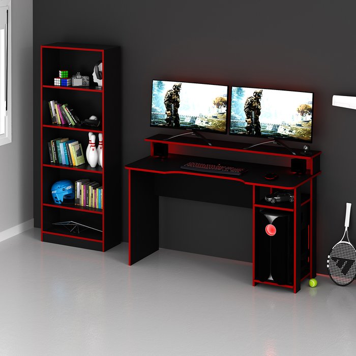 Kit Gamer Mesa Escrivaninha Para 2 Monitores + Estante Cor: Preto com Vermelho