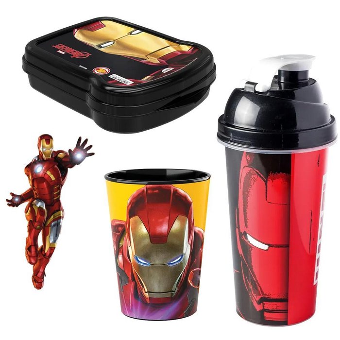 | Modelo | Kit garrafa shakeira homem de ferro marvel pote potinho copo |