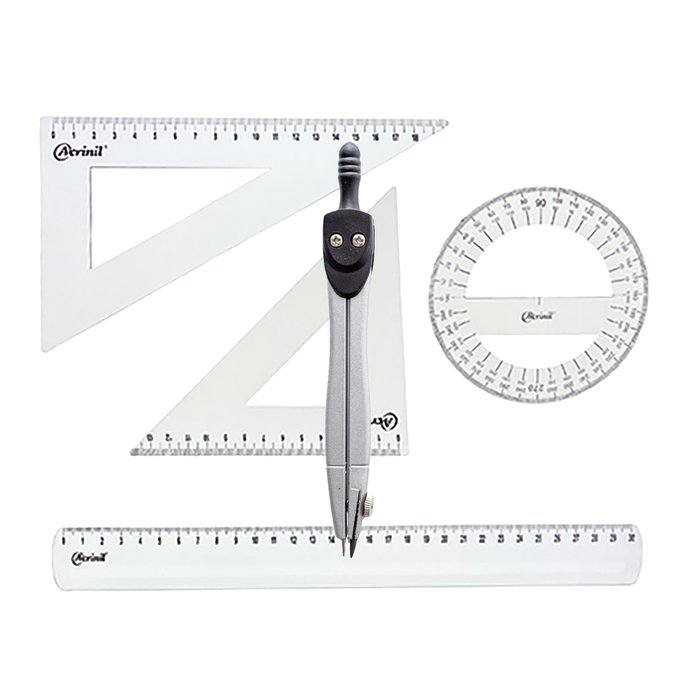 1 Esquadro 45° + 1 Esquadro 60° + 1 Transferidor 360° + 1 Régua 30cm + 1 Compasso