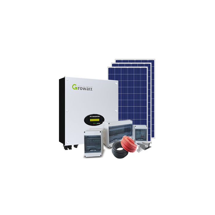 Este Kit tem potência de 7.260Wp. Antes da compra, consulte uma empresa especializada ou o responsável técnico de seu projeto. O Kit é composto pelo seguintes itens: Quantidade Equipamento 2 Inversor Growatt 3000W - Modelo 3000S 22 Painéis Solares 330W 2 Monitor WiFi 2 Par Conectores MC4 70 Metros Cabo Fotovoltaico Preto 70 Metros Cabo Fotovoltaico Vermelho 2 StringBox 2 QDCA ESPECIFICAÇÃO TÉCNICA PAINEL SOLAR ESPECIFICAÇÕES Potência máxima (pmax) 330W Tensão de circuito aberto (voc) 46.1V Tensão máxima de energia (vmp) 37.3V Corrente de curto-circuito (isc) 9.38A Corrente máxima de potência (imp) 8.85A Eficiência do módulo (%) 17,02 % Tolerância de potência 0 ~ + 5W Ambiente de teste padrão Irradiância 1000W/m2, temperatura da célula 25 ℃, espectro AM1.5 Dimensões (A x L x C) 1956*991*35mm Peso 22Kg ESPECIFICAÇÃO TÉCNICA INVERSOR Aprovados pelo INMETRO, os inversores Growatt são do tipo ONGRID os quais convertem corrente CC gerada pelos módulos FV em corrente CA e inserem esta para a rede pública. Especificações Growatt 3000-S Potência Nominal CA 3000W Max Tensão CC de entrada 550V Max Corrente CC de entrada 13A Faixa de Tensão 70V-550V Tensão CA nominal 230V Frequência de rede CA 50Hz/60Hz Corrente Nominal CA 13.0A Fator de Potência >0.99 Grau de Proteção Ip65 Temperatura Ambiente de Operação -25…+60°C Altura (H) 320mm Largura (W) 271mm Comprimento (D) 142mm Peso 8.8Kg INFORMAÇÕES ADICIONAIS Monofásico 220V Eficiência máxima de 97.6% 1 MPPT Chave DC integrada Controle de Ruído Possibilidade de Monitoramento Remoto (módulo WiFi vendido separadamente) Fácil Instalação ESPECIFICAÇÃO TÉCNICA DETALHADA DO INVERSOR GARANTIAS Anos Equipamento 5 Inversor Growatt 10 Painéis Solares 330W 25 Estrutura