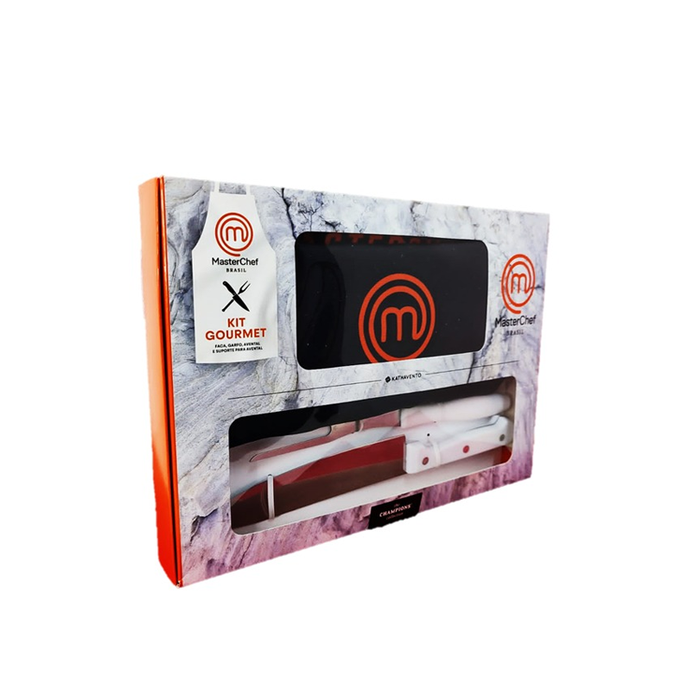 Kit Churrasqueiro do programa de culinária Masterchef! Kit gourmet com embalagem exclusiva! O kit contém: - 1 Faca; - 1 garfo; - 1 avental de tecido. O Kit Mesa Masterchef faz parte da linha exclusiva Masterchef Brasil! Aguardamos seu pedido! Obrigada pela preferência!