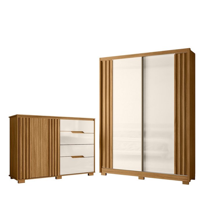 Kit Guarda Roupa 2 Portas Cannes e Cômoda Sapateira Munique M01 Freijó Off White Clique Chique