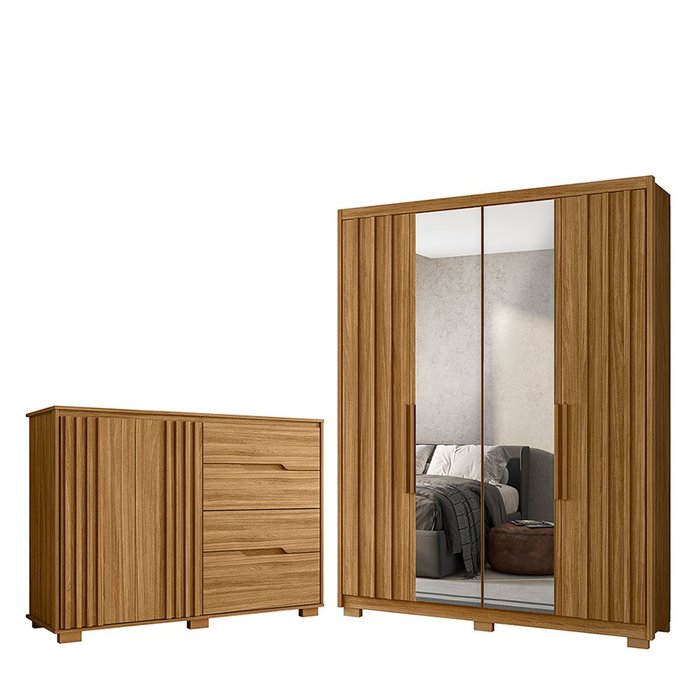 Kit Guarda Roupa C/ Espelho 4 Portas e Cômoda Sapateira Munique M01 Freijó Clique Chique