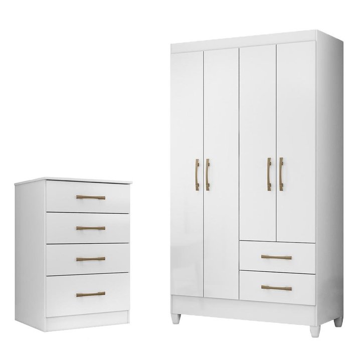 Querendo completar seu dormitório com um móvel charmoso e muito útil? Então você vai se encantar com este maravilhoso Guarda Roupa Chile. Com MDP de qualidade, ele é super-resistente e atraente. Os nichos, no amplo espaço interno, auxiliam na hora de organizar suas peças de roupas, seus acessórios e o que mais desejar guardar.A Cômoda MS vem junto para complementar o espaço com suas 4 gavetas sendo que a última é maior. Características do Guarda Roupa: - Produto em MDP- Corrediça metálica- Portas e frente de gaveta de 15 mm- Bastão em madeira reflorestado revestido- Pés em PVC- Quantidade de Portas: 04- Quantidade de Gavetas: 02- Quantidade de Cabideiros: 01- Quantidade de Calceiros: 01- Tipo de Porta: Bater- Possui Espelho: Não- Acompanha Manual de Montagem: Sim- Puxadores na cor bronze- Impressão UV- Garantia: 03 Meses Dimensões do Guarda Roupa: - Altura: 1,82 m- Largura: 1,03 m- Profundidade: 0,47 m Características da Cômoda: - Possui Portas: Não- Possui Gavetas: 04- Possui Prateleiras: Não- Possui Espelho: Não- Material Principal: MDP- Possui Cabideiros: Não- Possui Calceiro: Não- Tipo de Corrediça: Metálica- Material do Puxador: PVC- Possui Pés: Não- Garantia: 03 Meses- Tipo de Gaveta: Interna- Acompanha Manual de Montagem: Sim- Produto em MDP- 4 Gavetas- Corrediças metálicas- Última gaveta com tamanho maior Dimensões da Cômoda: - Altura: 0,90 M- Largura: 0,61 M- Profundidade: 0,47 M