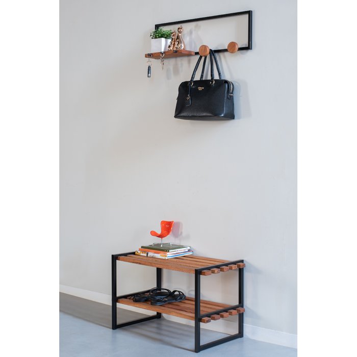 Um mimo para a entrada do seu Lar! Além de extremamente versátil o Hall de Entrada Dual segue o design contemporâneo industrial, trata-se de peças compostas por madeira maciça e aço carbono. Sua pintura eletrostática é a melhor disponível no mercado e o acabamento da madeira é Stan fosco hidro-repelente.