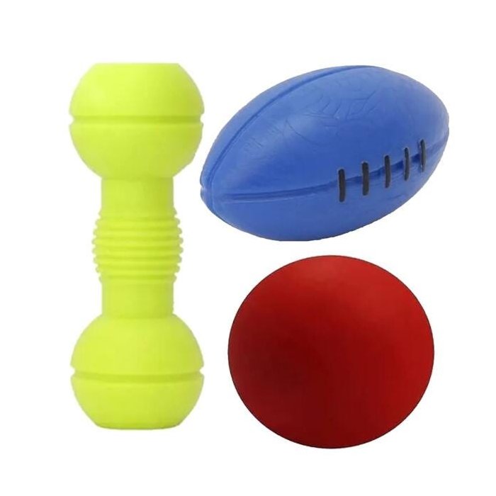 Dentre eles a "Bola grande de 10cm, o Halteres e a Bola de Futebol Americano" super resistente, destinados a cachorro de porte grande, de todas as raças destruidoras.