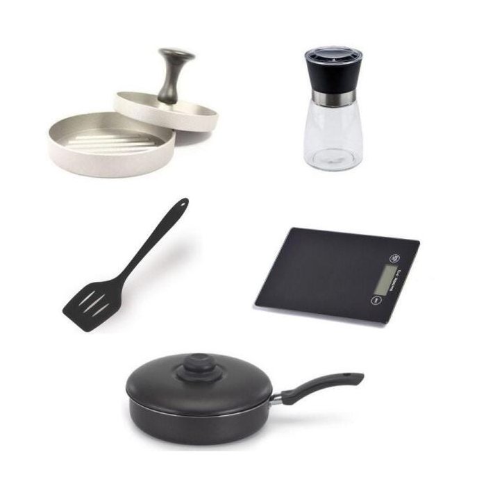 1 - Modelador de Hambúrguer de alúminio; 1 - Frigideira antiaderente com tampa numero 24; 1 - Moedor de Sal e Pimenta; 1 - Balança Digital de Cozinha;