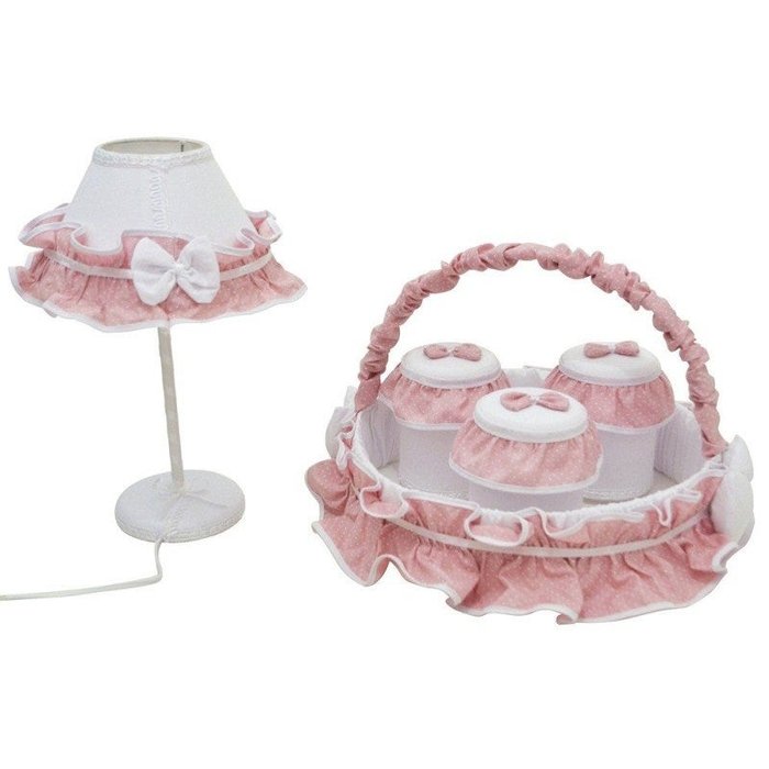 Kit Higiene 5 Peças Pvc Abajur, Cesta e Jogo de Potes Poá Rosê e Branco