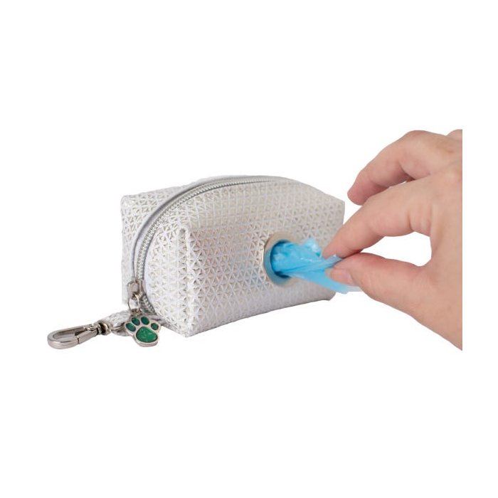 possui um design elegante com tecido metalizado e mosquetão para prender na guia, bolsa ou cinto.