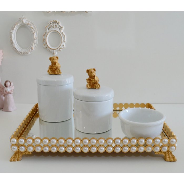 Bandeja perola e espelho - pés de resina - 31,5 larg x 22,5 prof