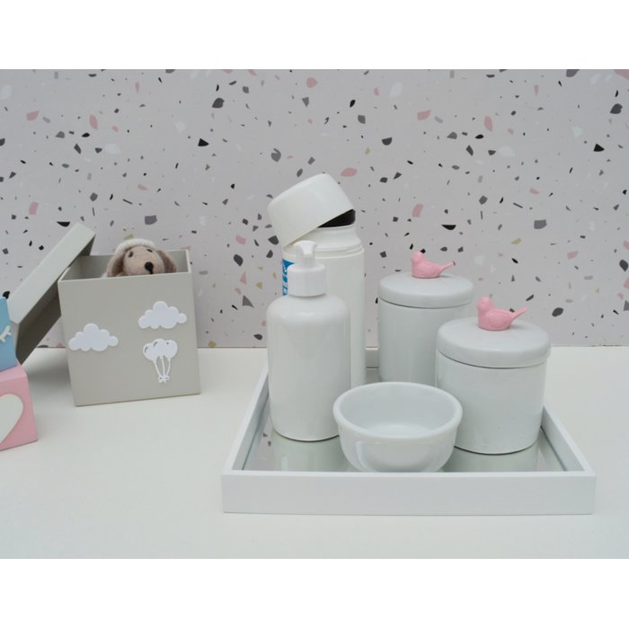 Kit Higiene Porcelana Bebê Bandeja Térmica Potes Cuidados Banho Maternidade K010 Pássaro Rosa.