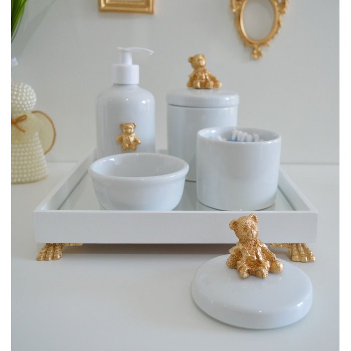 Kit Higiene Porcelana Bebê Banho Cuidado Quarto K014 Urso - Dourado Branco e Dourado