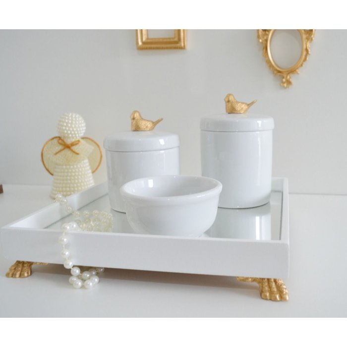 Kit Higiene Porcelana Bebê + Potes + Bandeja - Passaro Dourado Branco e Dourado