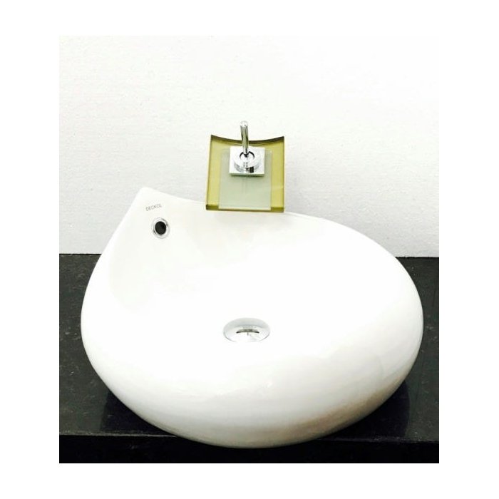 Dimensões: 46,5 x 19,5cm material: cerâmica. kit 4 peças com cuba de louça de sobrepor gota, válvula click cromada para lavatórios, torneira cascata quadrada de vidro temperado dourado e sifão cromado