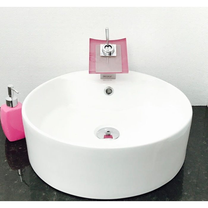 Dimensões: 46,5 x 17cm material: cerâmica. kit 5 peças com cuba de louça redonda de sobrepor com apoio para torneira, válvula click cromada, torneira cascata quadrada de vidro temperado rosa, sifão cromado e saboneteira de porcelana rosa