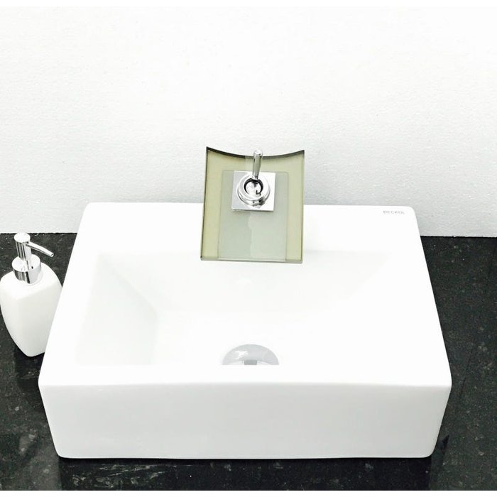 Dimensões: 42,5 x 30 x 13cm material: cerâmica. kit 5 peças com cuba de louça retangular com apoio para torneira, válvula click cromada, torneira cascata quadrada de vidro temperado champanhe, sifão cromado e saboneteira de porcelana branca
