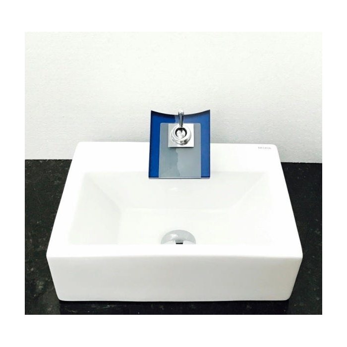 Dimensões: 42,5 x 30 x 13cm material: cerâmica. kit 3 peças com cuba de louça retangular com apoio para torneira, válvula click cromada para lavatórios e torneira cascata quadrada de vidro temperado azul