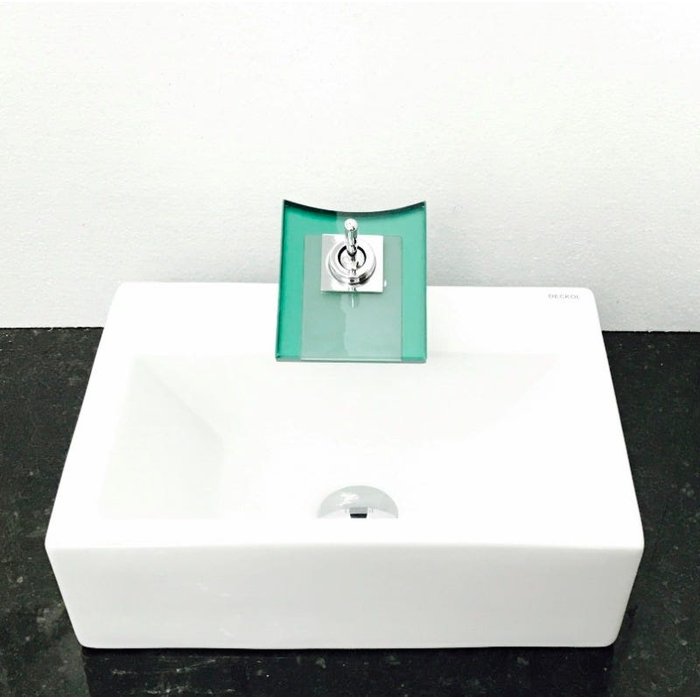Dimensões: 42,5 x 30 x 13cm material: cerâmica. kit 4 peças com cuba de louça retangular com apoio para torneira, válvula click cromada, torneira cascata quadrada de vidro temperado verde e sifão cromado