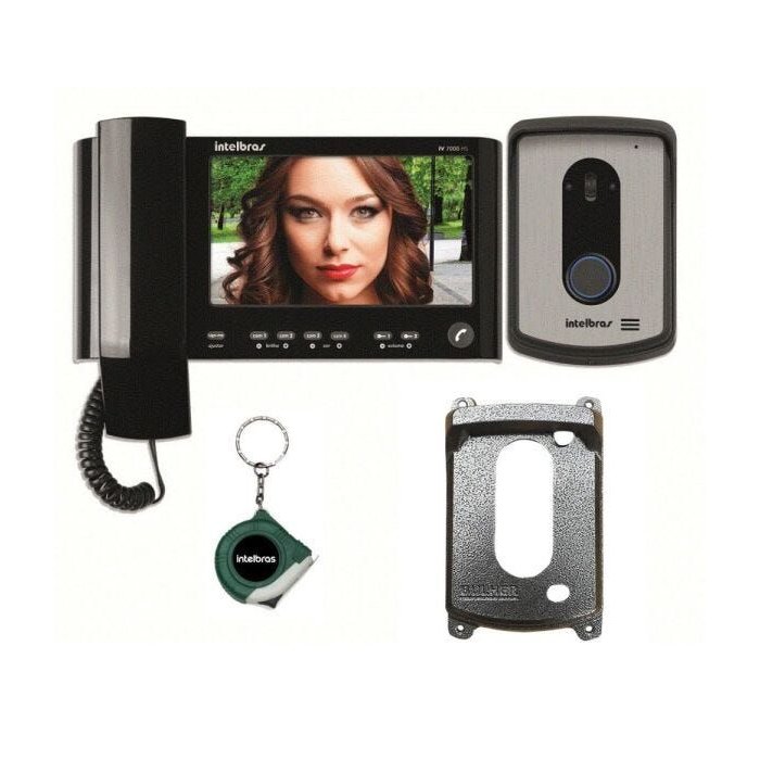 Conteudo do Kit: 1 Unidade - Video Porteiro IV 7010 HS 4520024 Preto Intelbras ( 1 Modulo interno 1 Modulo Externo) 1 Unidade - Protetor Antifurto e Antivandalismo para modulo externo. 1 Unidade - Trena de 1m em material emborrachado - Intelbras Videoporteiro IV 7010 HS permite a visualização das imagens de até 4 ambientes diferentes 24 horas por dia na tela do videoporteiro. Além de permitir o atendimento do seu visitante de qualquer lugar do mundo, pois você poderá conversar e abrir a porta da sua casa através¹ de um telefone fixo ou celular. (via pabx ) Características Técnicas: * Comunicação viva-voz ou por monofone; * Display widescreen TFT - LCD de 7', com proporção 16:9; * Alimentação no módulo externo e no módulo interno com fonte externa de 12V e 500 mA ou alimentação direta da rede AC de 90 a 240V (automática). O IV 7010 HS possui capacidade para 4 canais de vídeo permitindo a visualização de até quatro ambientes diferentes, e, graças aos LEDs infravermelhos, é possível captar imagens mesmo em locais sem iluminação. Além disso, o videoporteiro permite inúmeras configurações, podendo, inclusive, ser conectado a centrais de alarme, DVRs (gravadores digitais de vídeo) e PABX (central telefônica), realizando a função Siga-me para um telefone fixo ou celular. Ampla visão Monitore até 4 ambientes diferentes 24 horas por dia, através do display de 7 polegadas, ou, se preferir, fixe o monitoramento em uma única câmera e visualize as imagens de um local específico. Acesso remoto (função Siga-me) O IV 7010 HS encaminha¹ a chamada para o seu celular. Com isso, mesmo que você não esteja em casa, é possível conversar e até mesmo abrir a porta para seus visitantes. ¹ Via PABX. Verifique disponibilidade com a sua operadora. Ajuste de ângulo na instalação No momento da instalação, é possível ajustar o ângulo da câmera permitindo o melhor posicionamento para identificar os visitantes. Visualize seu visitante pela TV O videoporteiro IV 7010 HS pode ser conectado ao televisor permitindo que você visualize o visitante através da TV. Também é possível conectá-lo a um gravador de imagens para gravar e acessar as imagens remotamente. Abertura de portas e portões Cada módulo externo possui saída para 2 fechaduras. Assim, é possível abrir portas ou portões individuais com fechaduras eletromecânicas e portões de garagem que utilizem acionamento de relé (disponível no módulo externo do IV 7010 HS).