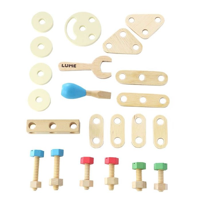 Kit Inventando e Consertando - Parafusos, Chave de Fenda, Chave de Boca, Brinquedo de Madeira - Lume