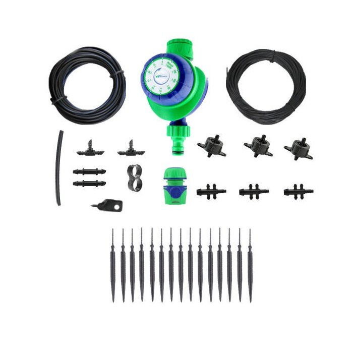 Itens Inclusos: 01 Temporizador Maunual 2h 01 Concector Engate Rápido 0,3 Tubo de Polietileno PELBD 1342 02 Conector p/ Microtubo 4mm 01 Adaptador Fim de Linha 13mm 8m Tubo de Polietileno PELBD 0437 02 Conector Te 4mm 03 Gotejador 2,2 LPH 03 Conector 4 Saidas 15m Tubo Flexivel de PVC 15 Estaca Gotejadora 01 Vazador 4mm