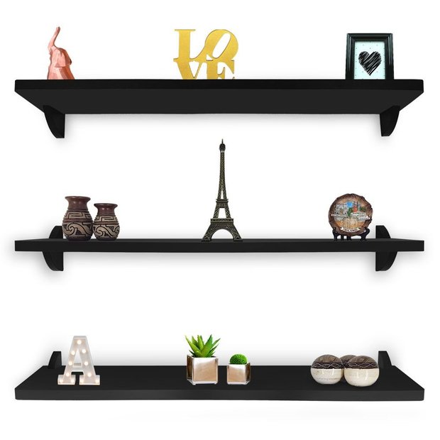 Kit Jogo 3 Prateleiras De Parede Madeira MDP Preto 90 X 20 Preto Fosco