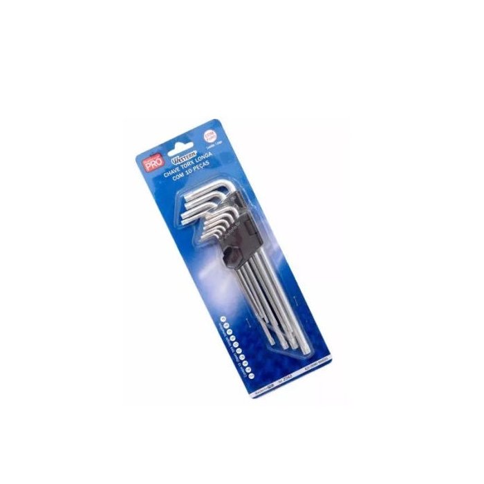Jogo de chaves torx longa contendo 10 peças, ideal para uso profissional. Desenvolvida para serviços com parafusos “torx”, muito usado em automóveis. No formato parecido com uma estrela, possuem seis pontos de apoio para o aperto ou desaperto do parafuso.