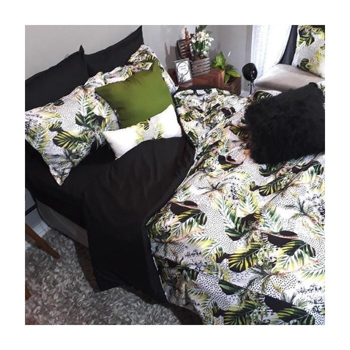 Kit em microfibra estampa tropical em tons de verde oliva, lima, preto e cinza - Ideal para decorar o seu cantinho com um ar tropical moderno e descontraído, a combinação florestal com preto amplia a possibilidade de incluir essa criação da grife em várias tons de ambientes diferentes, combina com tudo.
