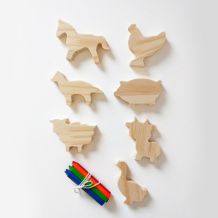 Contem sete (7) bichos de madeira e um (1) kit giz de cera.