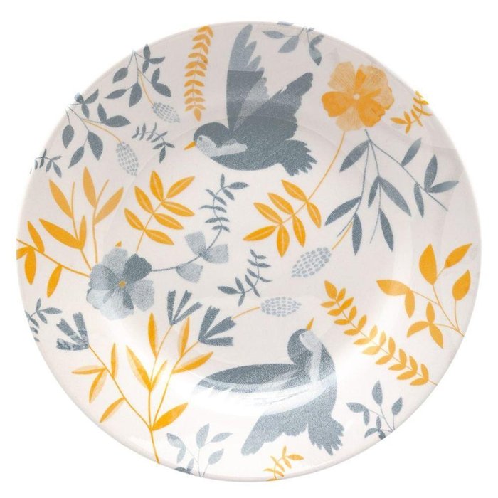 Donna Bem-te-vi é a decoração que representa a fauna e flora do Brasil nos pratos da coleção. Em tons de amarelo e azul claro, ramos, flores e o delicado passarinho Bem-te-vi decoram cada peça.