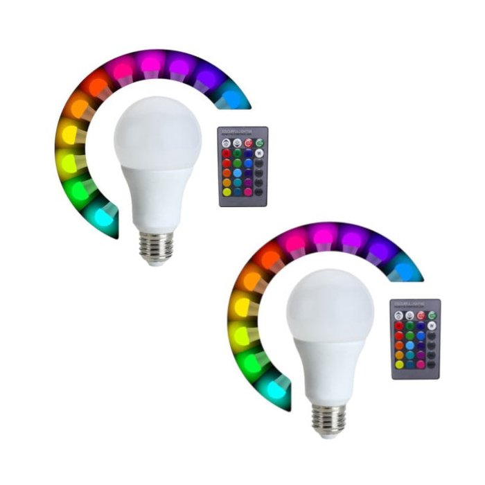 Kit Lâmpadas E27 Led RGB com Controle Remoto 2 Peças.Lâmpada RGB características com excelente brilho e ângulode iluminação completa e pode ser amplamente utilizado para oescritório, loja, exposição, corredores, bares, uso domésticoe outros tipos de iluminação ou decoração.Funções do Controle Remoto: Acende/Apaga, 4 Níveis deIntensidade na escolha da Cor, Função Flash, Função Smooth,Função Fade e Função Strobe.Base da lâmpada: E27Luz: LED.entrada: AC85V-265V 50-60Hz.consumo: 5WMaterial: liga de Alumínio e ABS.Itens inclusos:1.(Um) Kit Lâmpadas E27 Led RGB com Controle Remoto 2 Peças.1.(Um) Mês garantia contra defeito de fabricação.