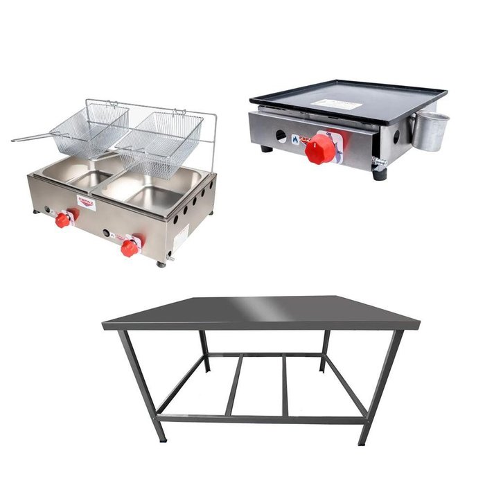 Esse Kit conta com Mesa de Manipulação para você preparar os alimentos, Fritadeira para fritura de suas porções e uma Chapa para preparação do seu cardápio!