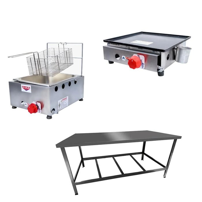 Esse Kit conta com Mesa de Manipulação para você preparar os alimentos, Fritadeira para fritura de suas porções e uma Chapa para preparação do seu cardápio!